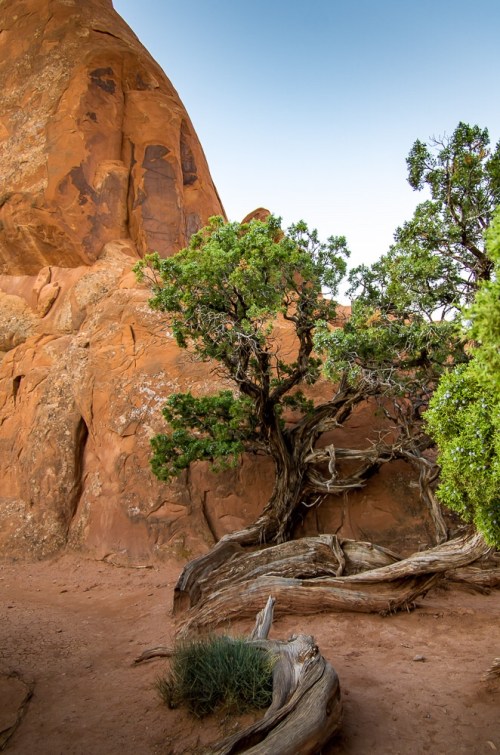 We are somewhere about 5 hours shy of Grand Tetons National Park. Hopefully we will be there tomorrow, but I couldn't let Arches go before posting just one more photograph. Plants and trees struggle for life and make for some very interesting forms and shapes. Here is one of my favorites. Not a great shot, but a nice memory.