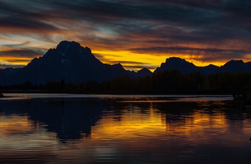 These are the last days of our stay in Grand Tetons before we head up to Yellowstone. Everyday has been a wonderful surprise. I got to travel around the park with Jack, a friend of mine from the San Antonio Camera Club. Then my wife Kim and I traveled almost exactly the same route, but it had a totally different, yet no less adventure filled feel. Then last night, Kim and I met up with Dick, another friend from the camera club. We had a nice dinner at the Colter Bay Restaurant, and then we were off to get the sunset at the iconic Oxbow Bend turnout.