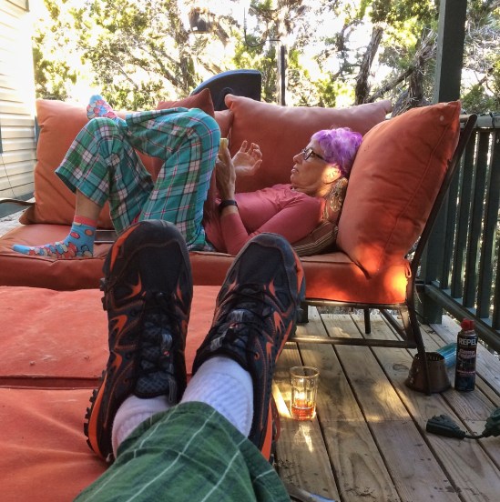 Nice shoes ;-). The porch looks inviting, ours will be covered in snow in about 4 hours… safe travels and we are looking forward to trip posts!
