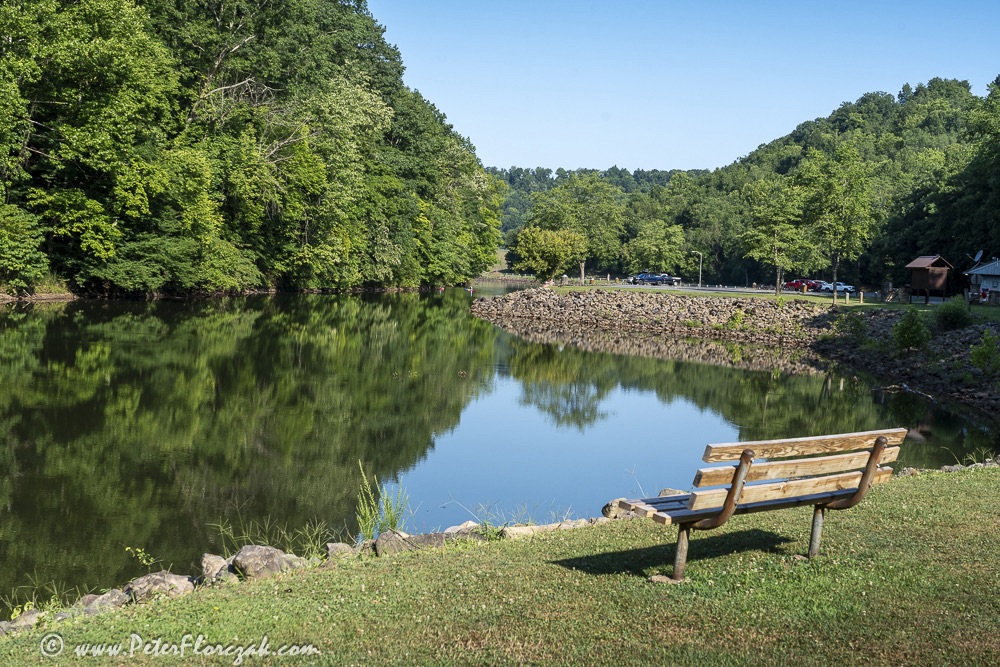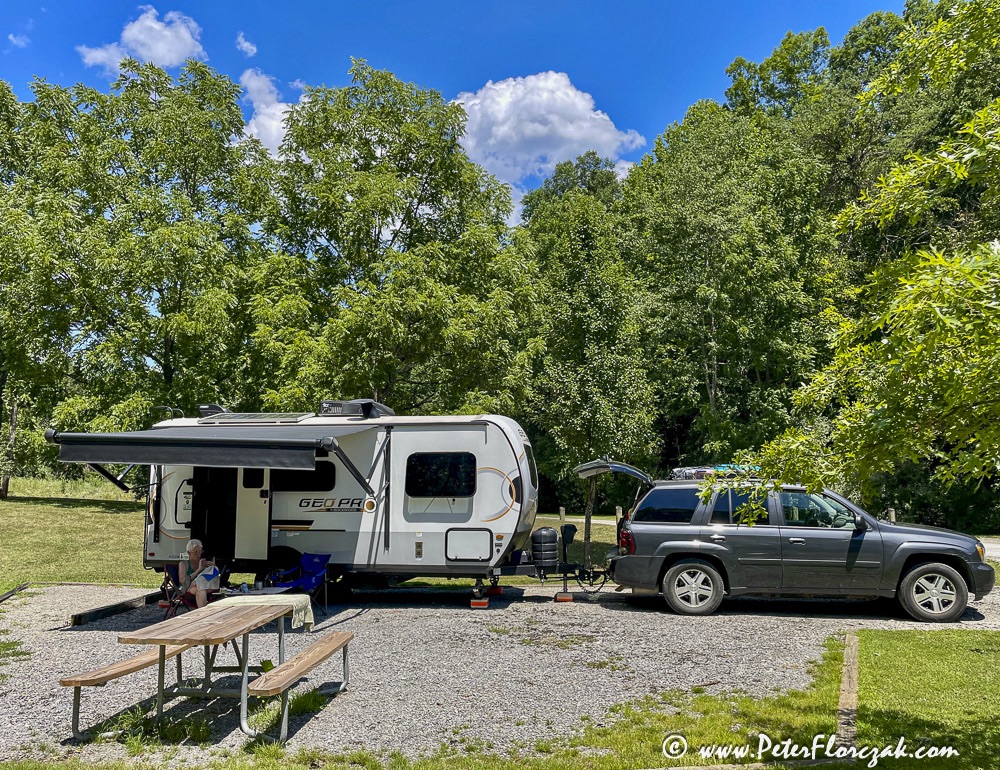 The first park we stayed in was an army corps park called Riffle Run Park in West Virginia. We secured the last available spot which, unfortunately came without electric. So even though it was closing in on 100 degrees—no ac! We were in full on sunshine, so it was a good test to see how well our solar system charged our 200 watt lithium batteries. Everything worked perfectly, exactly as it should, however you need a lot more watts to run an ac!