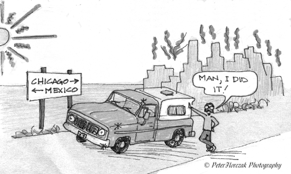 The first night I stopped at a road side park in Missouri. As I crawled in the back of the camper shell it started to snow. I got under some old wool army blankets. I was cold as hell, but hell I knew that I had a big grin on my face, but the smile was short lived as the realization of the situation hit me. Here I was in the middle of Bumfuck, USA with so much junk that not even the garbage man would take it. I had no friends, very little money and I’m in a truck that just a few weeks ago was a frozen popsicle! Oh my god, what have I done? Stay focused I thought. If you can make it to Mexico before the truck breaks down you will be all right. Then you can trade stuff for repairs. But what if it breaks down before I get there? Then what am I going to do for money. $360 does not go to far when you have over 1500 miles to go.