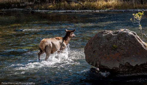 Jack, Kim and I started out at about 3:30pm. It is about and hour drive from our campsite to the main event, but like all drives in Yellowstone there were a couple of stops. The first one was a bull elk, but he proved to be too far to evectively photograph. The second stop was a family of elk just sitting and drinking in the stream.